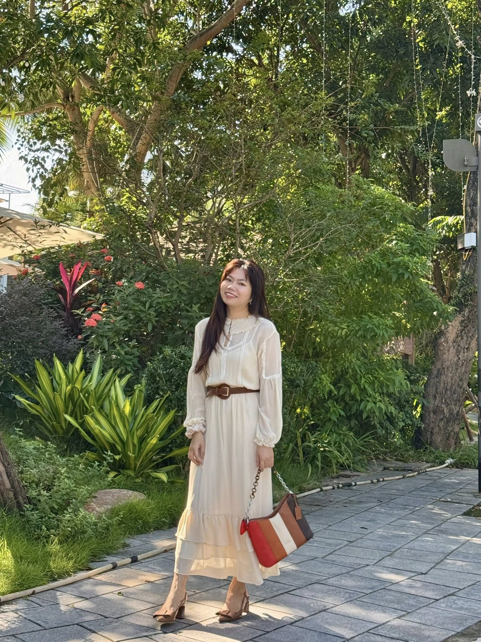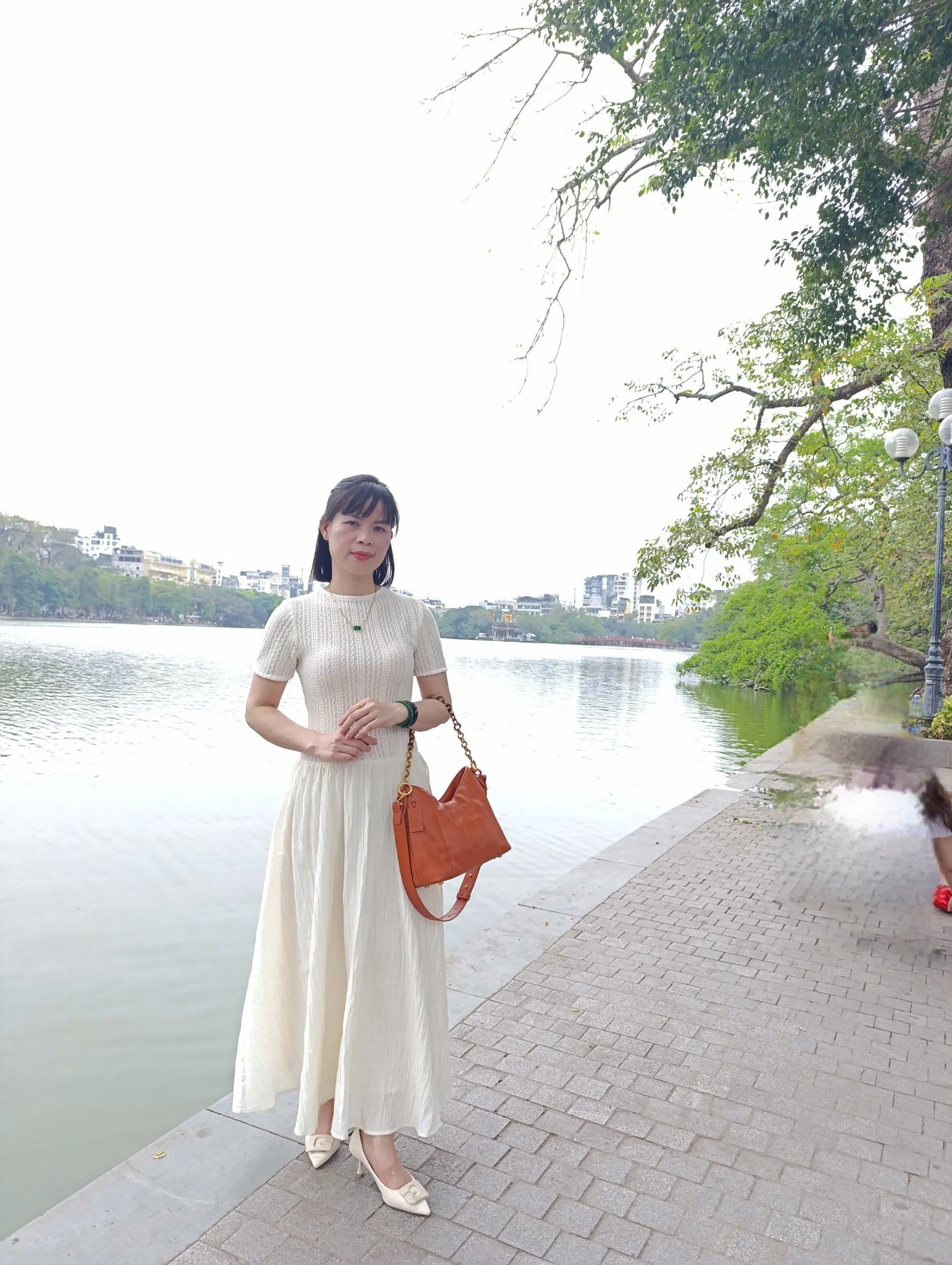Túi Da Thật DIỆP Ca Cao Cam Nóng được phối màu độc đáo nổi bật trên trang phục trắng tinh khôi
