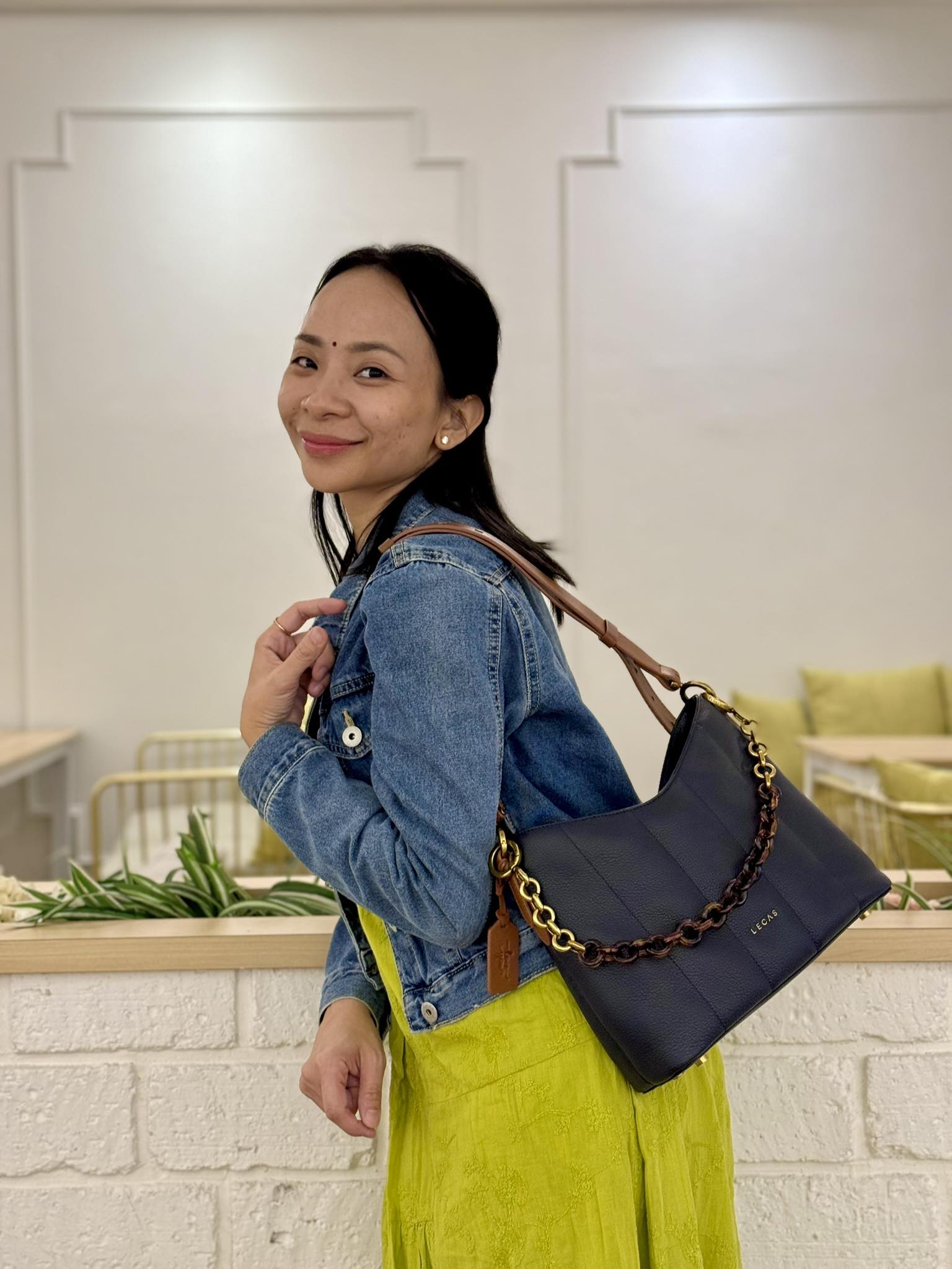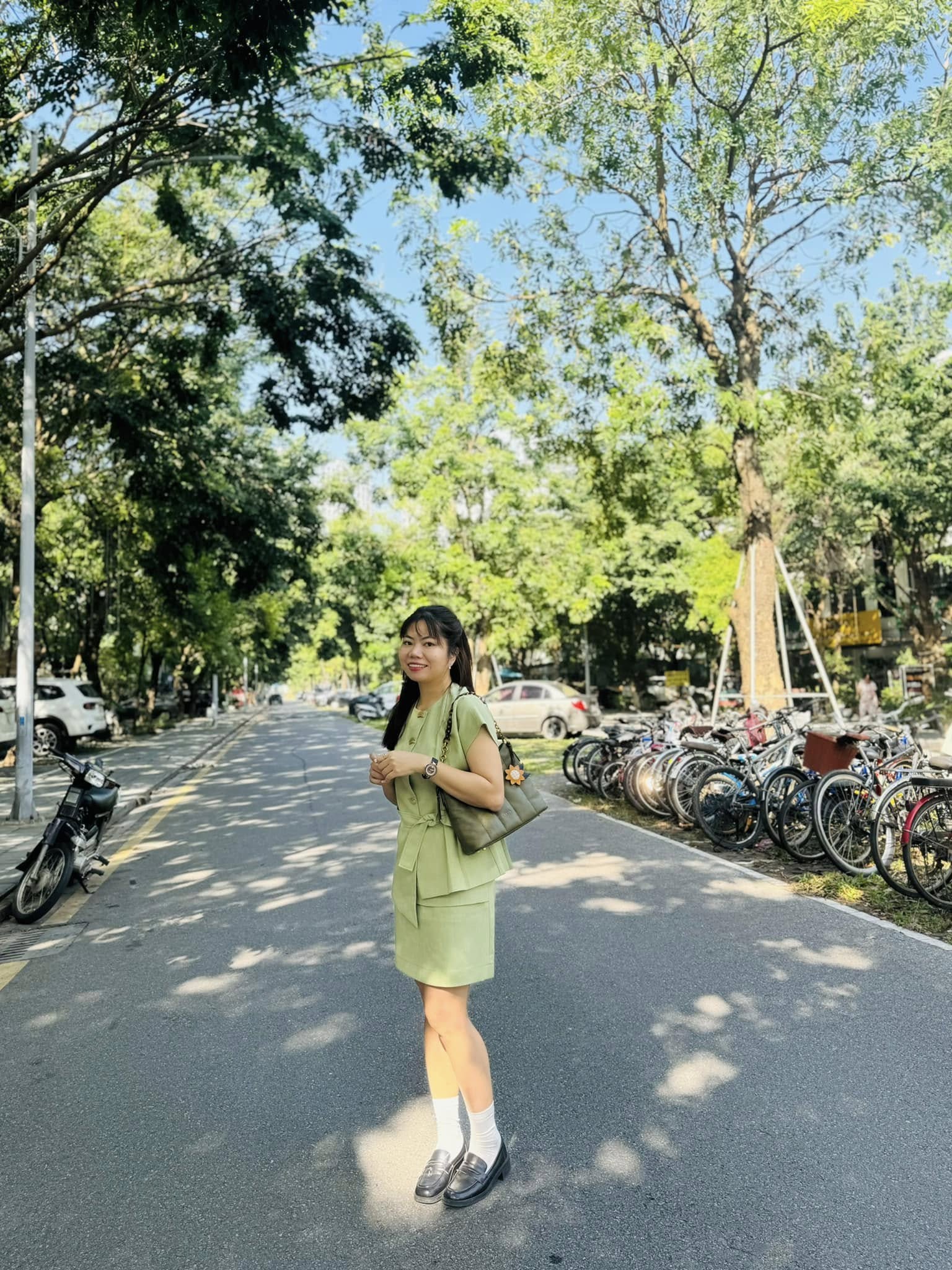 Túi Da Thật DIỆP xanh lục được kết hợp hài hoà với bộ trang phục cùng tông màu, tạo nên vẻ tươi mới
