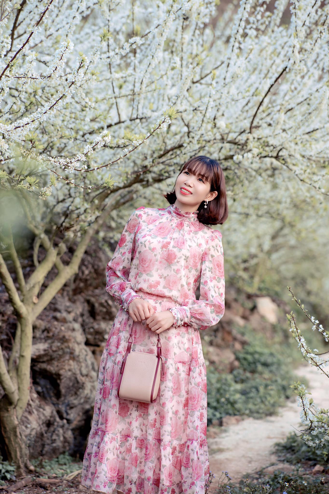 Túi Điện Thoại MANGO màu hồng phấn với thiết kế đơn giản được kết hợp hài hoà cùng trang phục hoạ tiết đồng màu