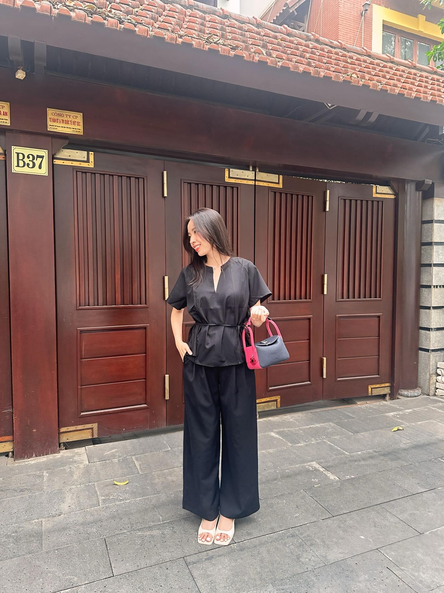 Túi THU ÚT phối màu đen hồng là điểm nhấn đầy tinh tế tôn lên bộ trang phục đơn sắc