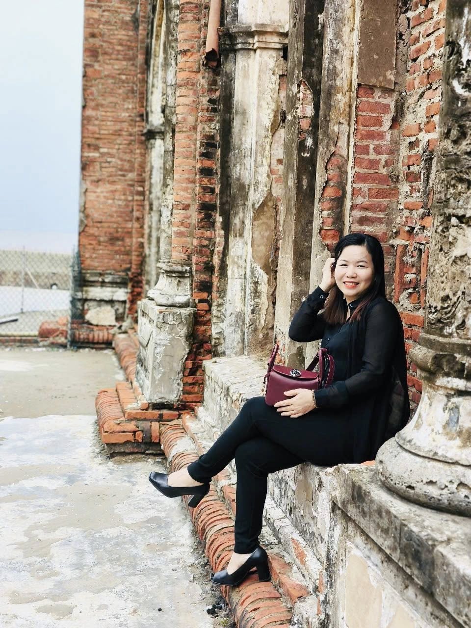 Túi THU ÚT đỏ mận cùng chất da bóng loáng là một điểm thu hút sự chú ý cho tổng thể trang phục